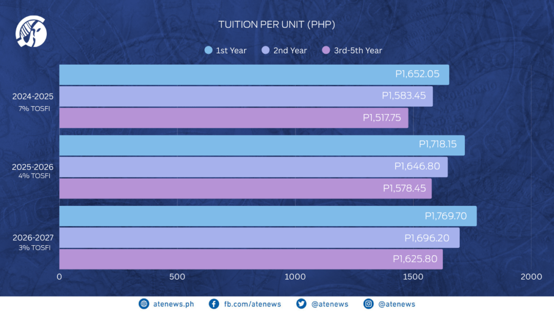 The 3% tuition raise translates to an increase of P51.55 per unit for incoming first-year students (P1,769.60), P49.40 per unit for second-year students (P1,696.20), and P47.35 per unit (P1,625.80) for third- to fifth-year students.